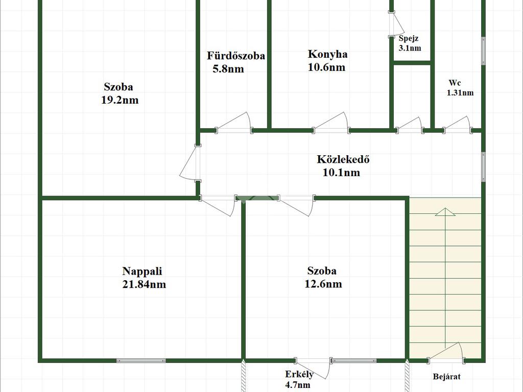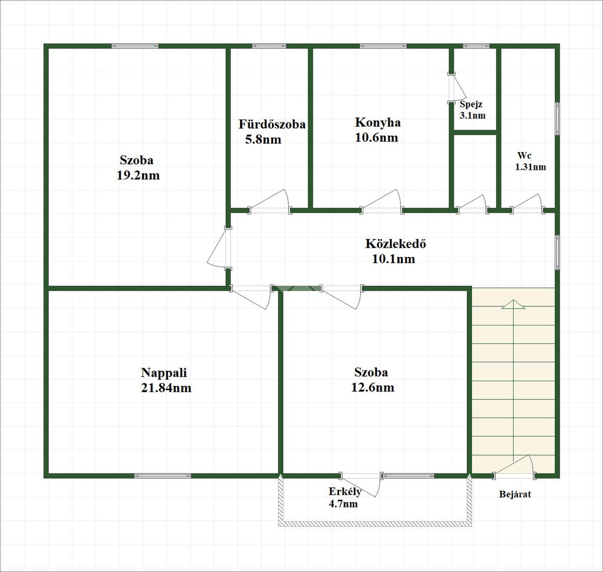 A ház 4 szobából áll, melyek közül az egyikhez erkély is kapcsolódik. A jól átgondolt elosztásnak köszönhetően találunk benne konyhát, étkezőt, 2 fürdőszobát, valamint külön WC-t is, így nagyobb család számára is kényelmes otthont biztosít.