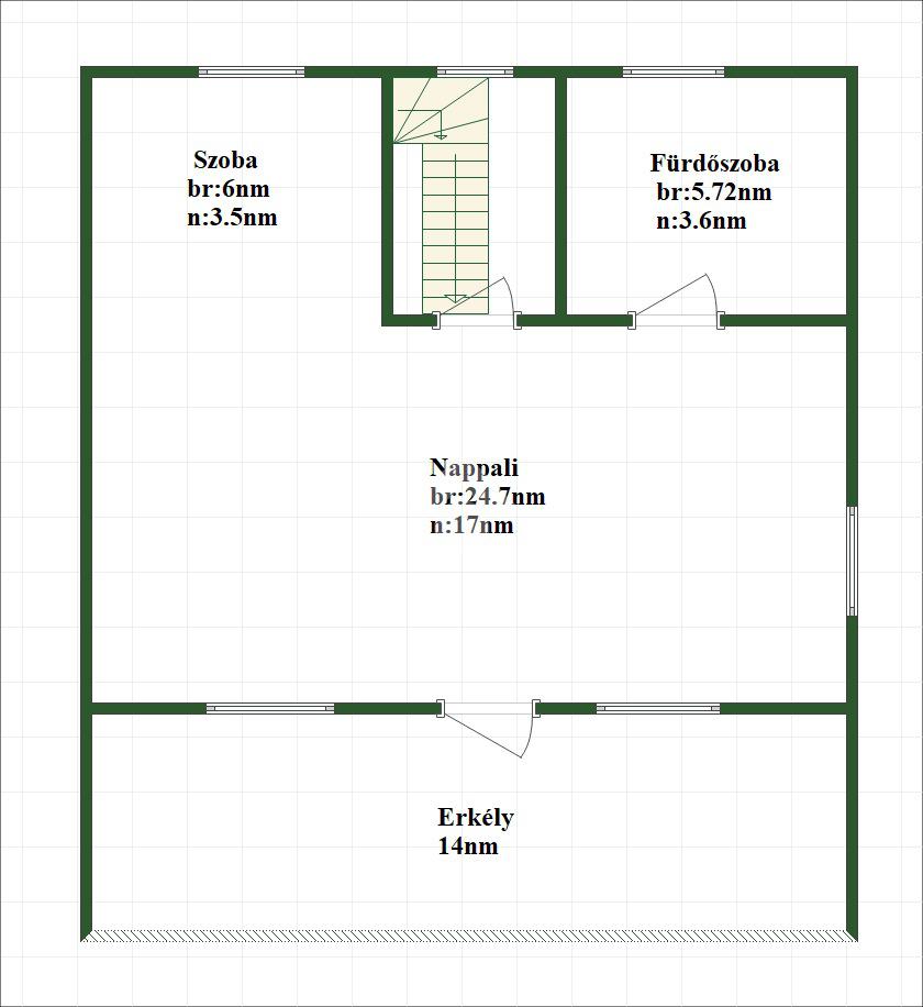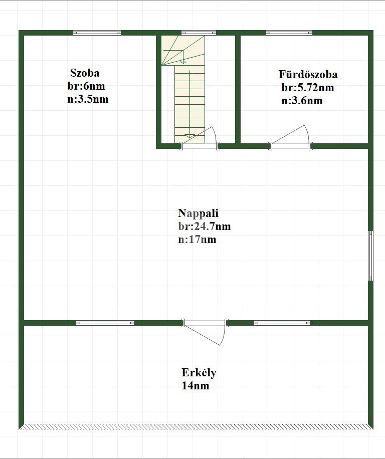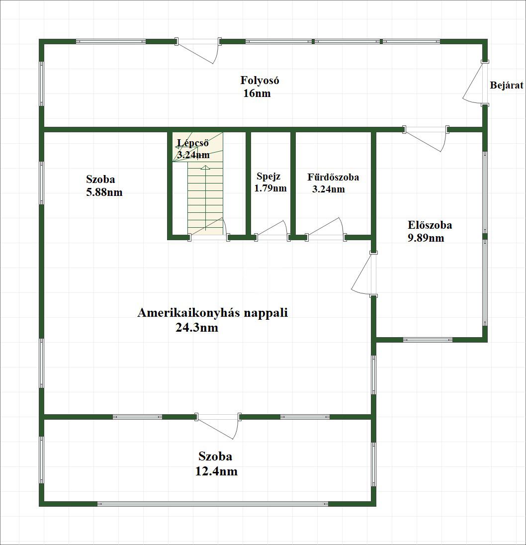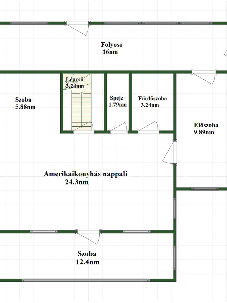Az alsó szinten tágas előszoba, közlekedő, amerikai konyhás nappali, egy külön szoba, fürdőszoba és spejz található.