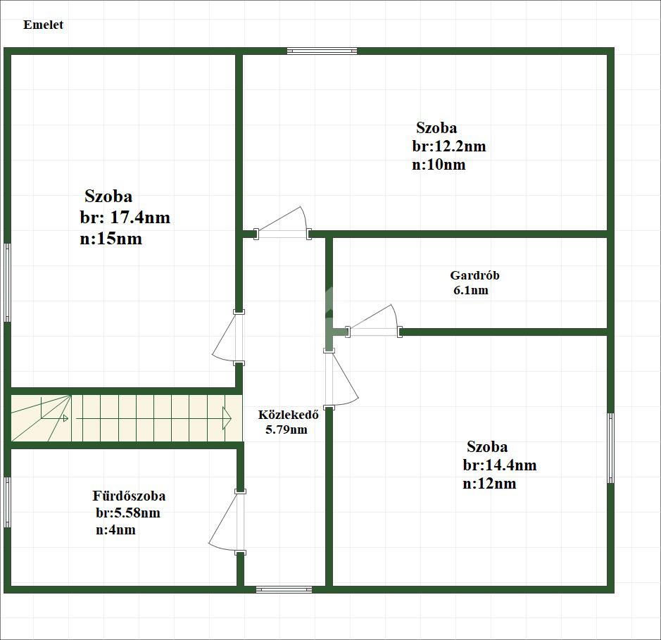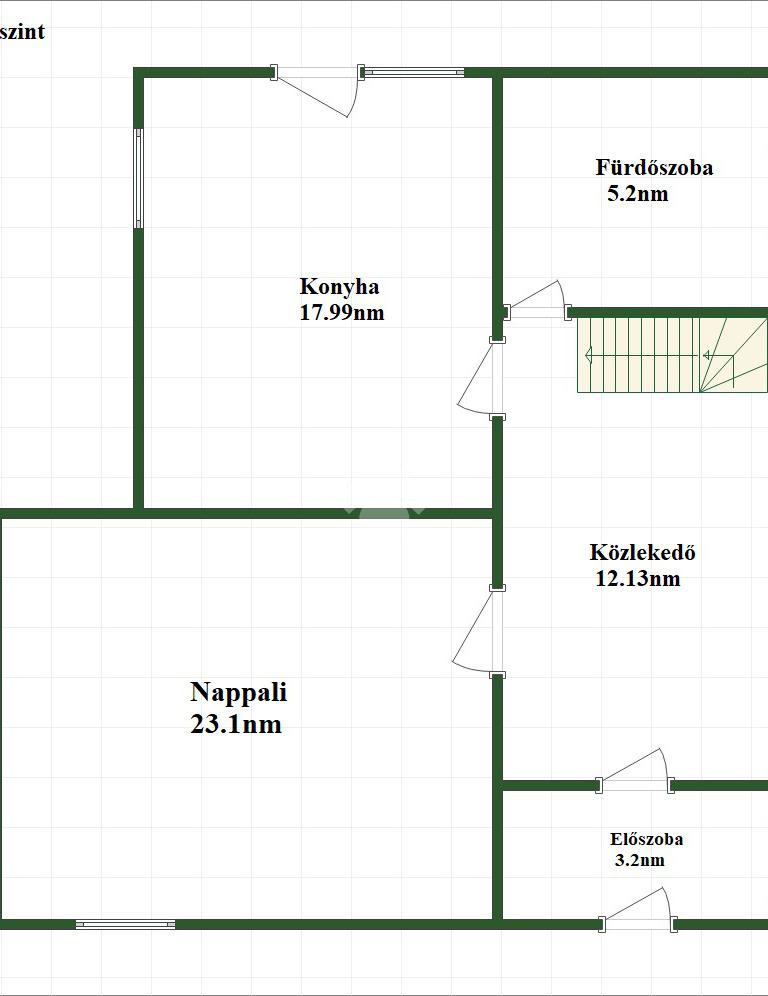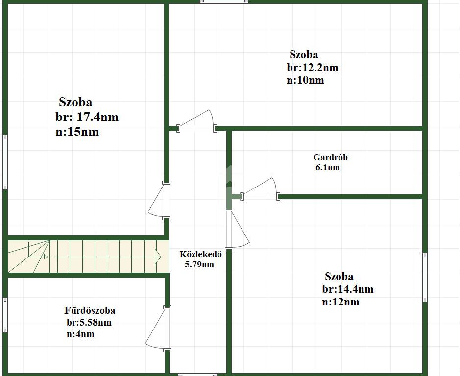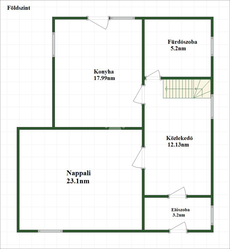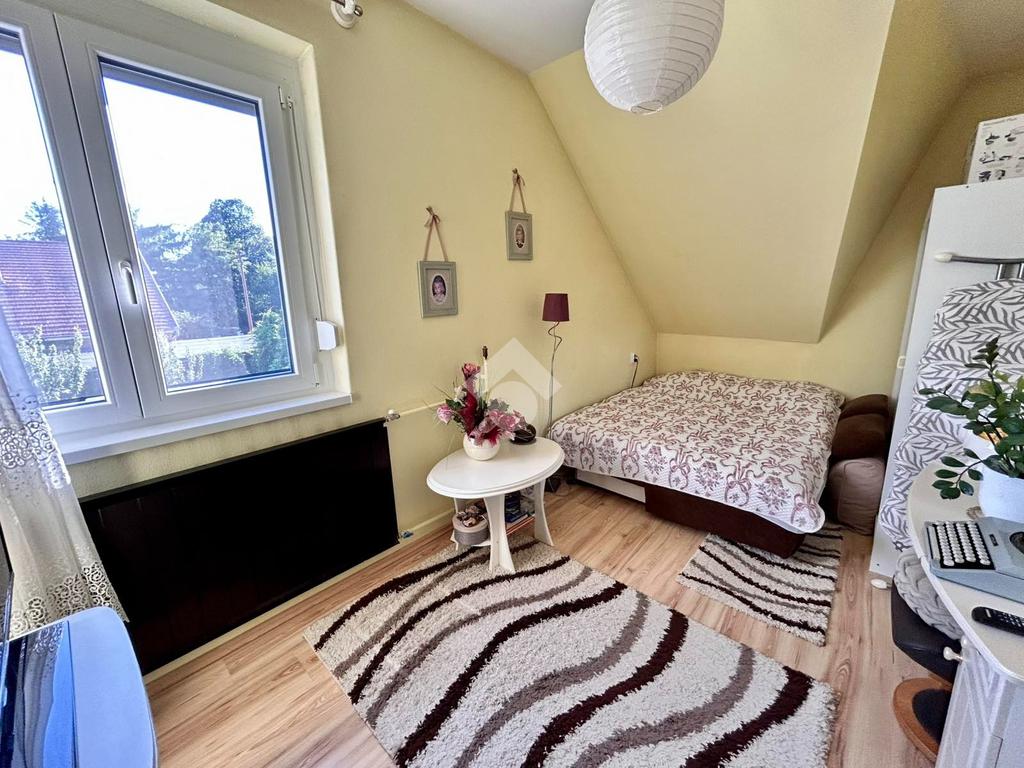 A földszinten egy előszoba, egy közlekedő, egy tágas konyha és nappali, valamint egy fürdőszoba WC-vel található. Az emeleten három külön nyíló szoba kapott helyet, továbbá egy gardrób és egy második fürdőszoba WC-vel. A ház belső terei világosak, tágasak és jól átgondolt elrendezésűek, így ideális akár nagyobb család számára is.