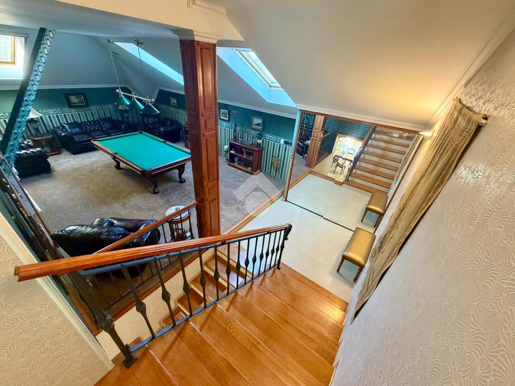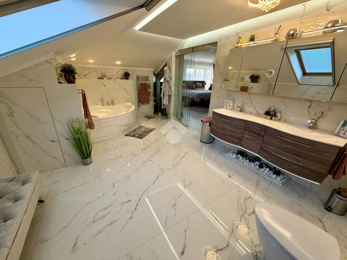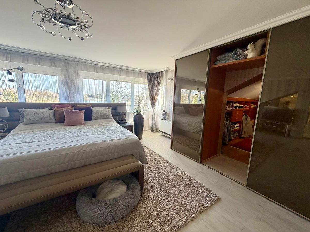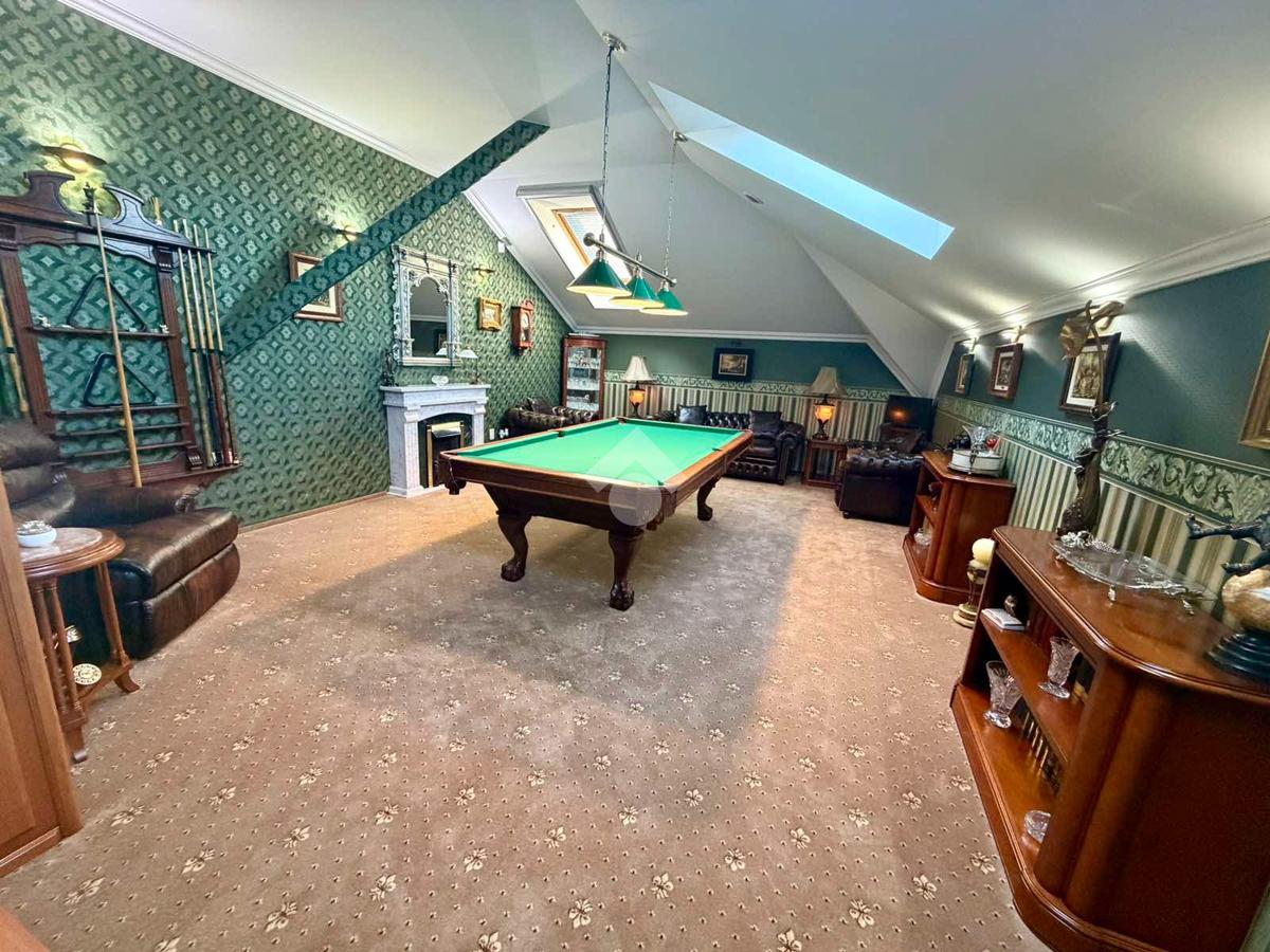 A következő félemeleten egy billiárd szoba kapott helyet, míg az emeleten egy világos nappali, dolgozószoba és két kényelmes hálószoba található, amelyek közül az egyik saját fürdőszobával rendelkezik. A szinten egy további fürdőszoba, mosókonyha, valamint egy praktikus gardrób is helyet kapott. Az ingatlan korszerű gépészeti megoldásai közé tartozik a geotermikus fűtési és hűtési rendszer, valamint az emeleten elhelyezett hűtő-fűtő klíma. A ház okosotthon rendszerrel is felszerelt, amely lehetővé teszi több funkció – például a fűtés, hűtés vagy világítás – kényelmes és modern vezérlését. A kényelmet és az egészséges lakókörnyezetet olyan további megoldások erősítik, mint a központi porszívó vagy a levegőtisztító rendszer. A házat egy kertész által gondozott, gyönyörűen parkosított kert veszi körül, amely automata locsolórendszerrel felszerelt, így a zöld környezet egész évben rendezett és gondozott marad.