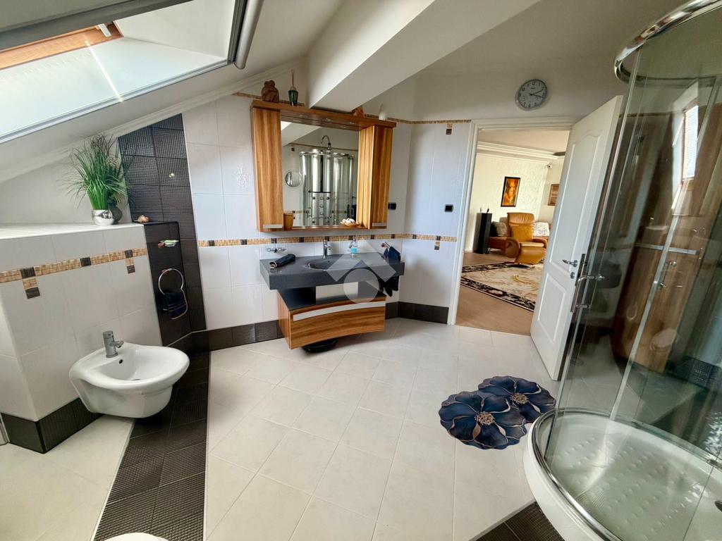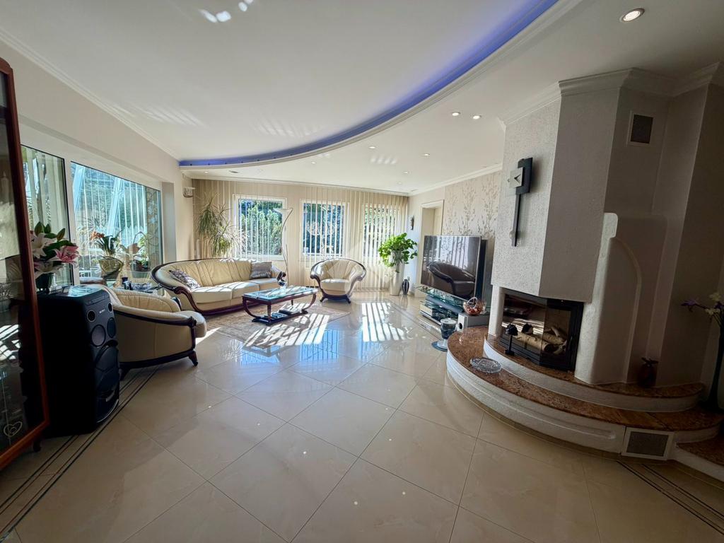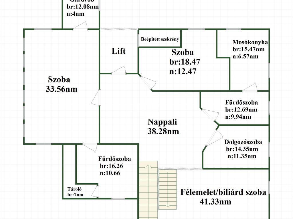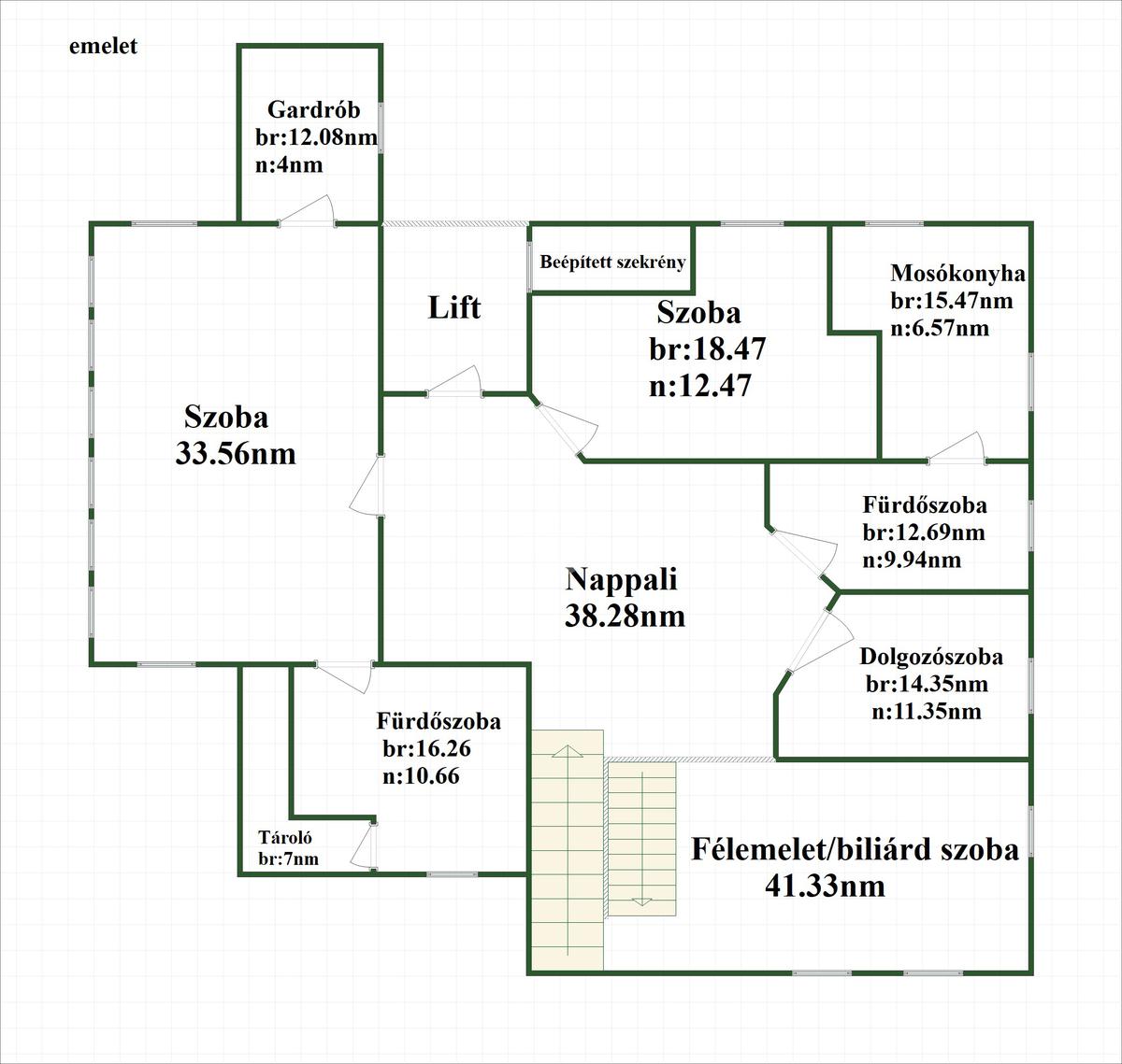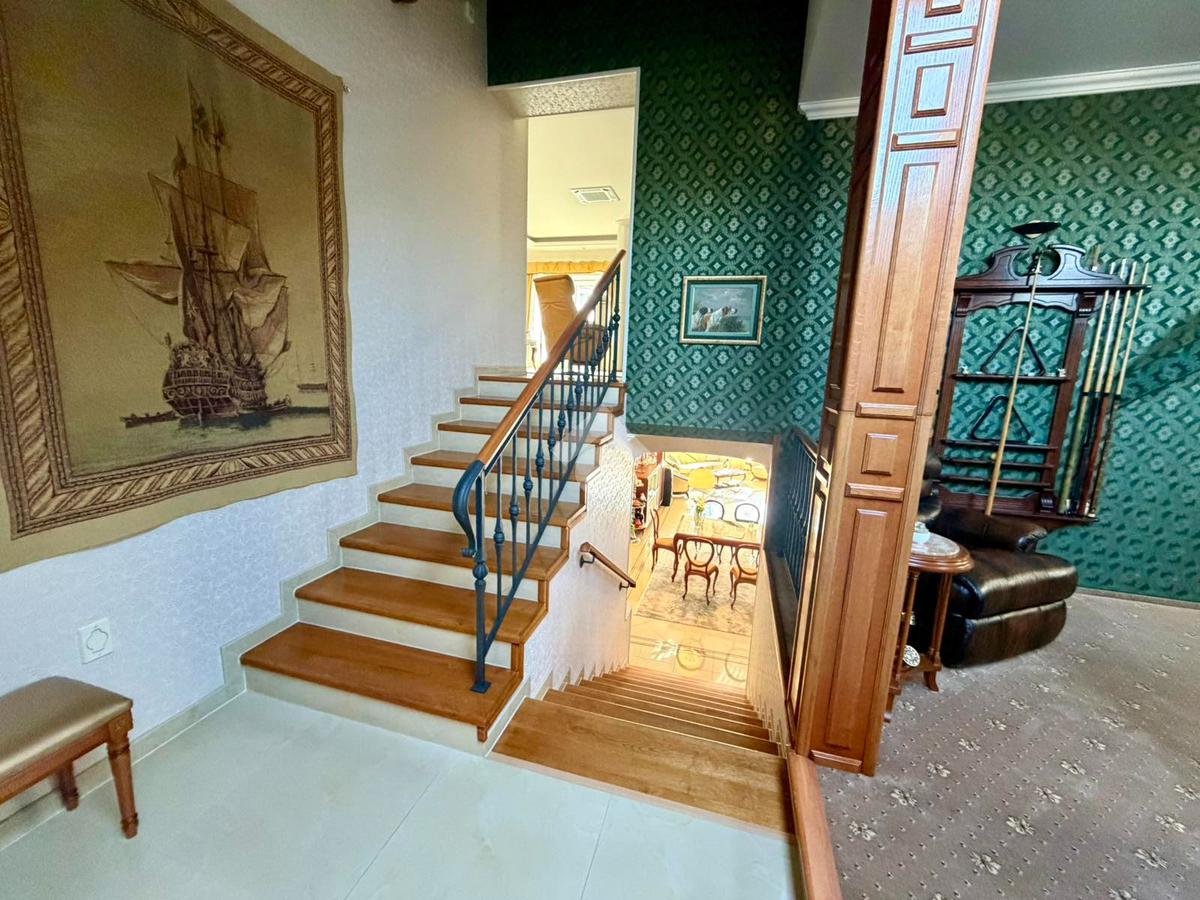 A következő félemeleten egy billiárd szoba kapott helyet, míg az emeleten egy világos nappali, dolgozószoba és két kényelmes hálószoba található, amelyek közül az egyik saját fürdőszobával rendelkezik. A szinten egy további fürdőszoba, mosókonyha, valamint egy praktikus gardrób is helyet kapott. Az ingatlan korszerű gépészeti megoldásai közé tartozik a geotermikus fűtési és hűtési rendszer, valamint az emeleten elhelyezett hűtő-fűtő klíma. A ház okosotthon rendszerrel is felszerelt, amely lehetővé teszi több funkció – például a fűtés, hűtés vagy világítás – kényelmes és modern vezérlését. A kényelmet és az egészséges lakókörnyezetet olyan további megoldások erősítik, mint a központi porszívó vagy a levegőtisztító rendszer. A házat egy kertész által gondozott, gyönyörűen parkosított kert veszi körül, amely automata locsolórendszerrel felszerelt, így a zöld környezet egész évben rendezett és gondozott marad.